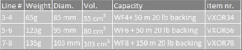 Un moulinet haut de gamme nécessite un frein de classe mondiale, une grande capacité de ligne, une construction légère mais toujours solide et enfin et surtout un design unique pour le séparer clairement de tous les autres moulinets du marché. C’étaient nos principales cibles avec les moulinets XO.• Grande tonnelle• Frein à clic réglable sur 3-4• Frein à disque étanche sur 5-6 et 7-8• Compteur intégré• Graisse pour roulements SKFLigne Diamètre Volume Poids Capacité#3-4 85mm 55cm3 65g WF4 + 50m 20lb support